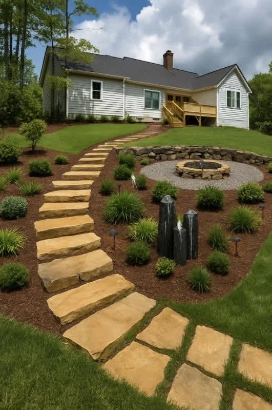 Stone steps offer a durable, natural transition on a sloped terrain. Ideal for residential landscapes as they blend functionality with organic beauty and improve access to outdoor areas.
