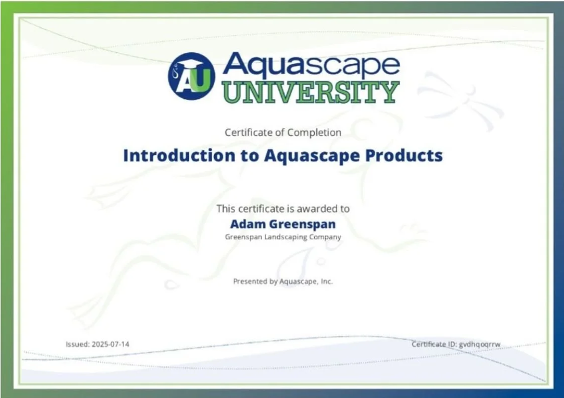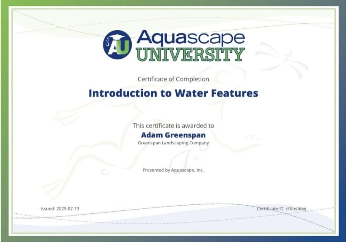 Owner and lead landscaper Adam Greenspan is trained through Aquascape University, a nationally recognized leader in eco-friendly water feature installation. He has completed the following certifications: